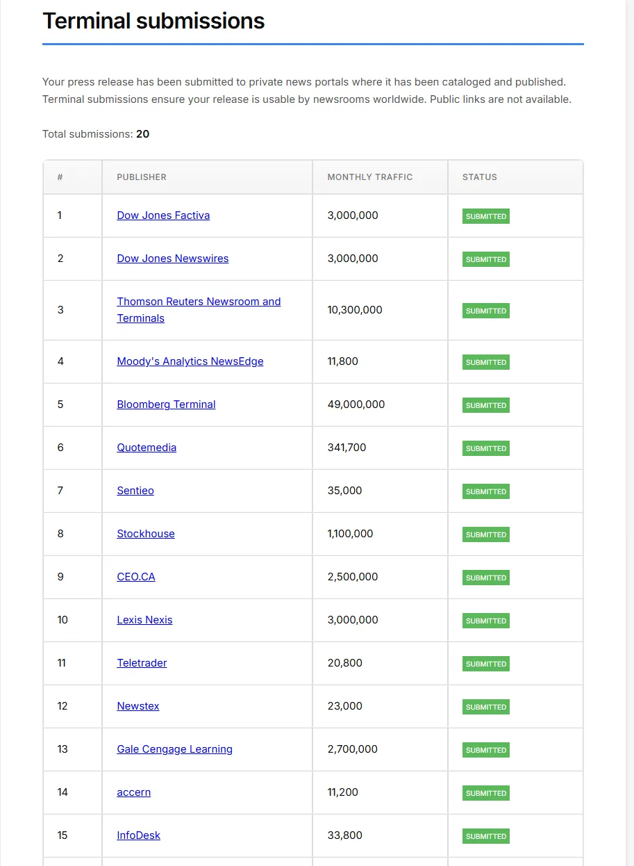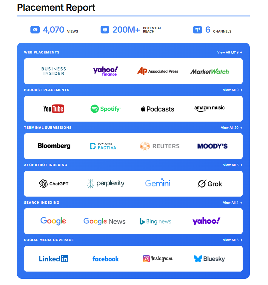 via Bloomberg Terminals, Reuters, and Dow Jones. Simultaneously, your campaign is converted into audio and distributed across Spotify, Apple Podcasts, and YouTube.